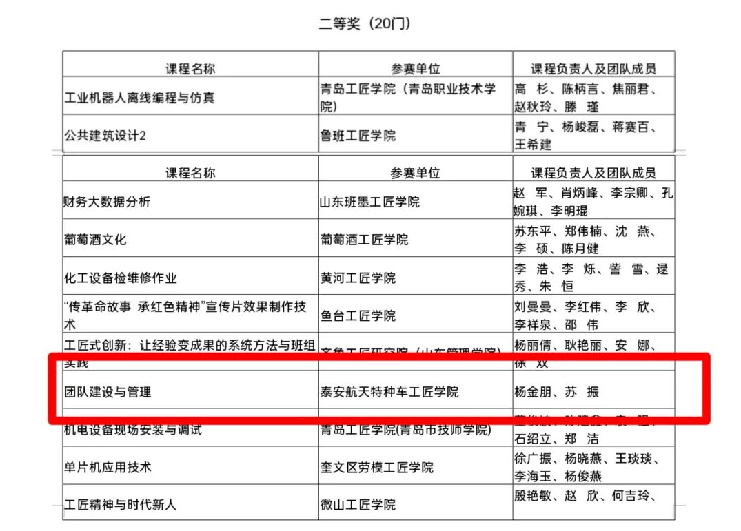 近日,火箭院泰航公司所属的泰安航天特种车工匠学院(简称“泰航公司工匠学院”)选送的《团队建设与管理》课程,首次荣获由山东省总工会、省教育厅、山东管理学院联合举办的2025年山东省工匠学院优质课程竞赛二等奖。这标志着泰航公司工匠学院在高技能人才培养与课程体系建设方面取得重要阶段性成果。