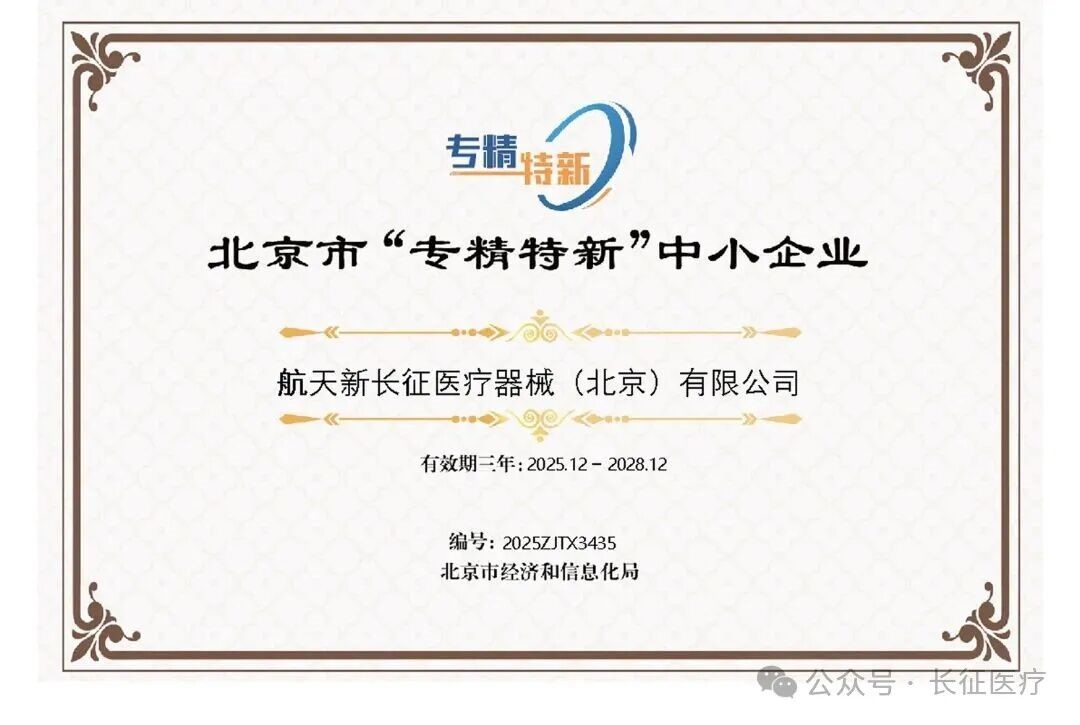 近日,火箭院航天新长征医疗器械(北京)有限公司(简称“长征医疗”)荣获北京市“专精特新”中小企业资质认定。不久前,公司还成功获评北京市“创新型”中小企业资质。